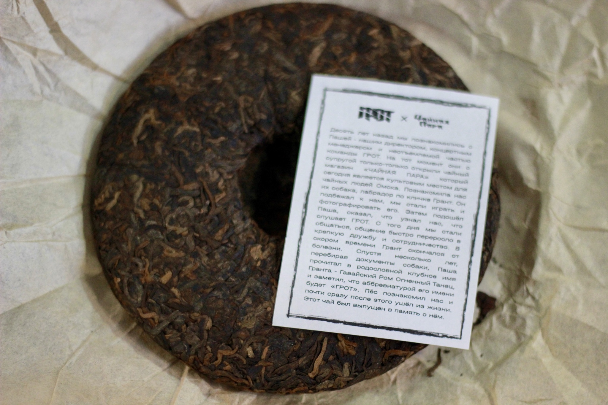 «Десять лет назад мы познакомились с Пашей - нашим директором, концертным менеджером и неотъемлемой частью команды ГРОТ. На тот момент они с супругой только-только открыли чайный магазин «ЧАЙНАЯ ПАРА» который сегодня является культовым местом для чайных людей Омска. Познакомила нас их собака, лабрадор по кличке Грант. Он подбежал к нам, мы стали играть и фотографировать его. Затем подошёл Паша, сказал, что узнал нас, что слушает ГРОТ. С того дня мы стали общаться, общение быстро переросло в крепкую дружбу и сотрудничество. В скором времени Грант скончался от болезни. Спустя несколько лет, перебирая документы собаки, Паша прочитал в родословной клубное имя Гранта - Гавайский Ром Огненный Танец, и заметил, что аббревиатурой его имени будет «ГРОТ». Пёс познакомил нас и почти сразу после этого ушёл из жизни. Этот чай был выпущен в память о нём.»
